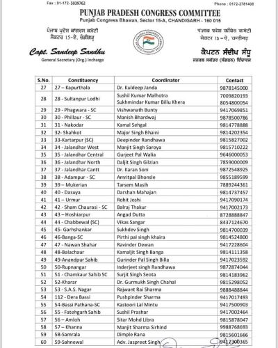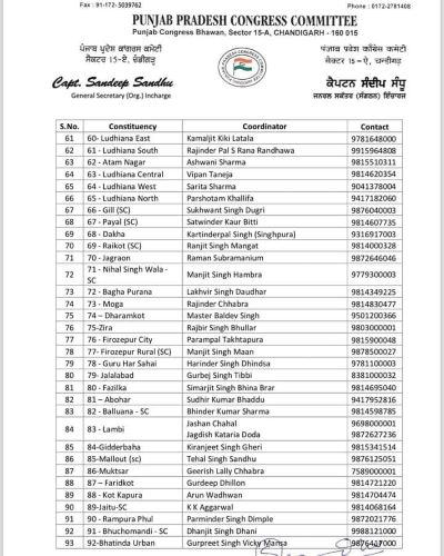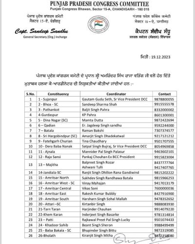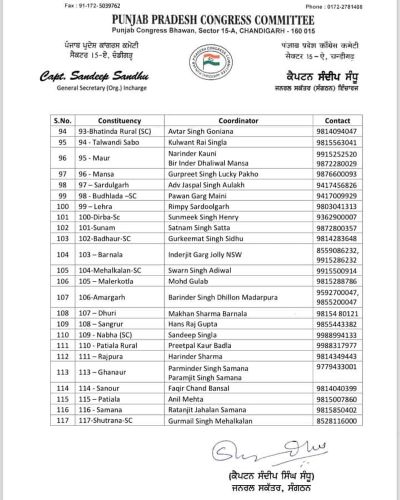 ਪੰਜਾਬ ਕਾਂਗਰਸ ਪ੍ਰਧਾਨ ਅਮਰਿੰਦਰ ਸਿੰਘ ਰਾਜਾ ਵੜਿੰਗ ਨੇ ਸੂਬੇ ਦੇ ਸਾਰੇ 117 ਹਲਕਿਆਂ ਲਈ ਕੋਆਰਡੀਨੇਟਰ ਨਿਯੁਕਤ ਕੀਤੇ ਹਨ।