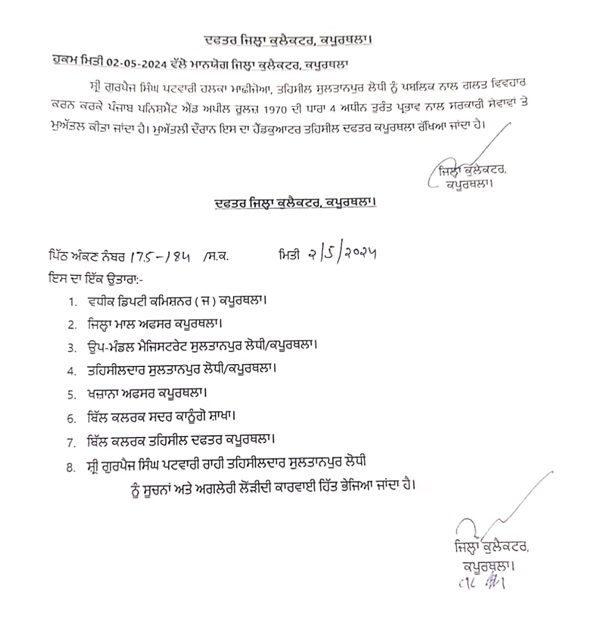 ਜ਼ਿਲ੍ਹਾ ਕੁਲੈਕਟਰ ਕਪੂਰਥਲਾ ਵਲੋਂ ਡਿਊਟੀ ਪਬਲਿਕ ਨਾਲ ਗਲਤ ਵਿਹਾਰ ਕਰਨ ਦੇ ਦੋਸ਼ਾਂ ਹੇਠ ਗੁਰਭੇਜ ਸਿੰਘ ਪਟਵਾਰੀ ਹਲਕਾ ਮਾਛੀ ਜ਼ੋਆ ਤਹਿਸੀਲ ਸੁਲਤਾਨਪੁਰ ਲੋਧੀ ਨੂੰ ਤੁਰੰਤ ਪ੍ਰਭਾਵ ਨਾਲ ਸਰਕਾਰੀ ਸੇਵਾਵਾਂ ਤੋਂ ਮੁਅੱਤਲ ਕਰਨ ਦੇ ਹੁਕਮ ਜਾਰੀ ਕੀਤੇ ਗਏ ਹਨ।ਉਨ੍ਹਾਂ ਵਲੋਂ ਜਾਰੀ ਹੁਕਮਾਂ ਅਨੁਸਾਰ ਪਟਵਾਰੀ ਗੁਰਭੇਜ ਸਿੰਘ ਨੂੰ ਸਰਕਾਰੀ ਡਿਊਟੀ ਦੌਰਾਨ ਪਬਲਿਕ ਨਾਲ ਗਲਤ ਵਿਹਾਰ ਕਰਨ ਹੇਠ ਪੰਜਾਬ ਪਨੀਸ਼ਮੈਂਟ ਐਂਡ ਅਪੀਲ ਰੂਲਜ਼ 1970 ਦੀ ਧਾਰਾ 4 ਅਧੀਨ ਤੁਰੰਤ ਪ੍ਰਭਾਵ ਨਾਲ ਸਰਕਾਰੀ ਸੇਵਾਵਾਂ ਤੋਂ ਮੁਅੱਤਲ ਕੀਤਾ ਜਾਂਦਾ ਹੈ। ਮੁਅੱਤਲੀ ਦੌਰਾਨ ਸਬੰਧਿਤ ਕਰਮਚਾਰੀ ਦਾ ਹੈੱਡਕੁਆਰਟਰ ਤਹਿਸੀਲ ਦਫਤਰ ਕਪੂਰਥਲਾ ਰੱਖਿਆ ਗਿਆ ਹੈ।ਖਬਰ ਨੂੰ ਵੱਧ ਤੋ ਵੱਧ ਅੱਗੇ ਸ਼ੇਅਰ ਕਰੋ-