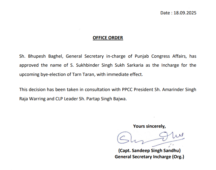 ਤਰਨਤਾਰਨ ਜਿਮਨੀ ਚੋਣ ਦੇ ਸਬੰਧ ਵਿੱਚ ਪੰਜਾਬ ਕਾਂਗਰਸ ਮਾਮਲਿਆਂ ਦੇ ਇੰਚਾਰਜ ਜਨਰਲ ਸਕੱਤਰ ਭੁਪੇਸ਼ ਬਘੇਲ ਨੇ ਤਰਨਤਾਰਨ ਦੀ ਆਉਣ ਵਾਲੀ ਉਪ ਚੋਣ ਲਈ ਇੰਚਾਰਜ ਵਜੋਂ ਸ. ਸੁਖਬਿੰਦਰ ਸਿੰਘ ਸੁੱਖ ਸਰਕਾਰੀਆ ਦੇ ਨਾਮ ਨੂੰ ਤੁਰੰਤ ਪ੍ਰਭਾਵ ਨਾਲ ਪ੍ਰਵਾਨਗੀ ਦੇ ਦਿੱਤੀ ਹੈ।