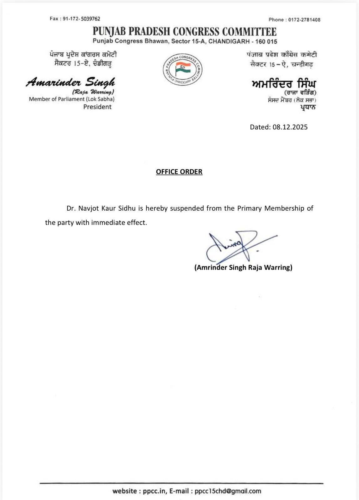 ਪੰਜਾਬ ਕਾਂਗਰਸ ਪ੍ਰਧਾਨ ਅਮਰਿੰਦਰ ਸਿੰਘ ਰਾਜਾ ਵੜਿੰਗ ਨੇ ਸਾਬਕਾ ਕ੍ਰਿਕਟਰ ਅਤੇ ਕਾਂਗਰਸੀ ਨੇਤਾ ਨਵਜੋਤ ਸਿੱਧੂ ਦੀ ਪਤਨੀ ਡਾ. ਨਵਜੋਤ ਕੌਰ ਨੂੰ ਪਾਰਟੀ ਤੋਂ ਮੁਅੱਤਲ ਕਰ ਦਿੱਤਾ ਹੈ। ਮੁੱਖ ਮੰਤਰੀ ਅਹੁਦੇ ਲਈ 500 ਕਰੋੜ ਰੁਪਏ ਦੇਣ ਬਾਰੇ ਨਵਜੋਤ ਕੌਰ ਦੇ ਬਿਆਨ ਨੇ ਪਹਿਲਾਂ ਹੀ ਪਾਰਟੀ ਅੰਦਰ ਹਲਚਲ ਮਚਾ ਦਿੱਤੀ ਸੀ।