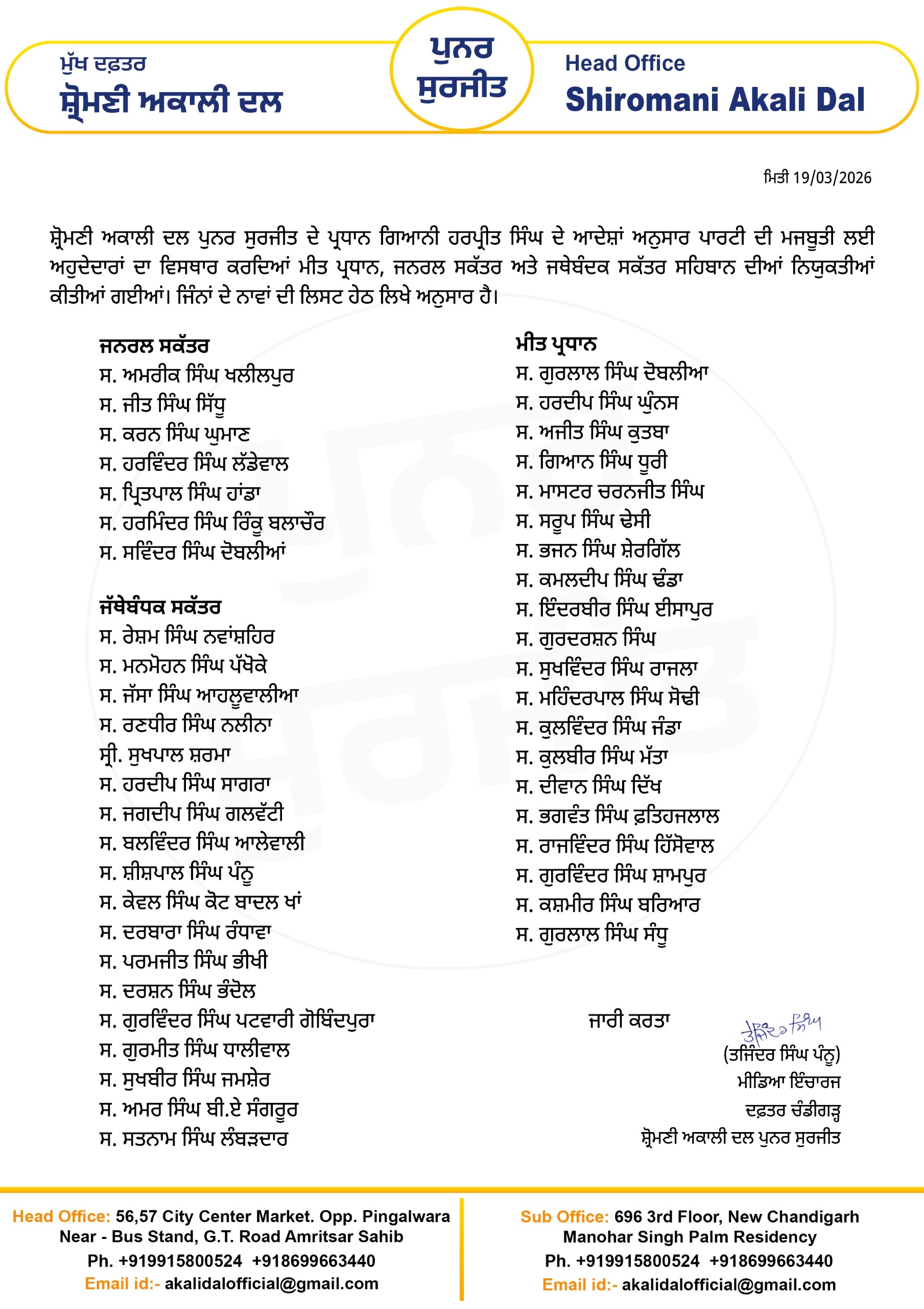 ਪੰਜਾਬ ਦੀ ਸਿਆਸਤ ਵਿੱਚ ਇੱਕ ਹੋਰ ਅਹਿਮ ਹਲਚਲ ਦੇਖਣ ਨੂੰ ਮਿਲੀ ਹੈ, ਜਿੱਥੇ ਸ਼੍ਰੋਮਣੀ ਅਕਾਲੀ ਦਲ ਪੁਨਰ ਸੁਰਜੀਤ ਵੱਲੋਂ ਪਾਰਟੀ ਦੇ ਢਾਂਚੇ ਨੂੰ ਮਜ਼ਬੂਤ ਕਰਨ ਲਈ ਵੱਡਾ ਫੈਸਲਾ ਲਿਆ ਗਿਆ ਹੈ। ਪਾਰਟੀ ਪ੍ਰਧਾਨ ਗਿਆਨੀ ਹਰਪ੍ਰੀਤ ਸਿਘ ਦੇ ਆਦੇਸ਼ਾਂ ਅਨੁਸਾਰ ਅਹੁਦੇਦਾਰਾਂ ਦਾ ਵਿਸਥਾਰ ਕਰਦਿਆਂ ਵੱਖ-ਵੱਖ ਅਹੁਦਿਆਂ ‘ਤੇ ਨਵੀਆਂ ਨਿਯੁਕਤੀਆਂ ਦਾ ਐਲਾਨ ਕੀਤਾ ਗਿਆ ਹੈ।